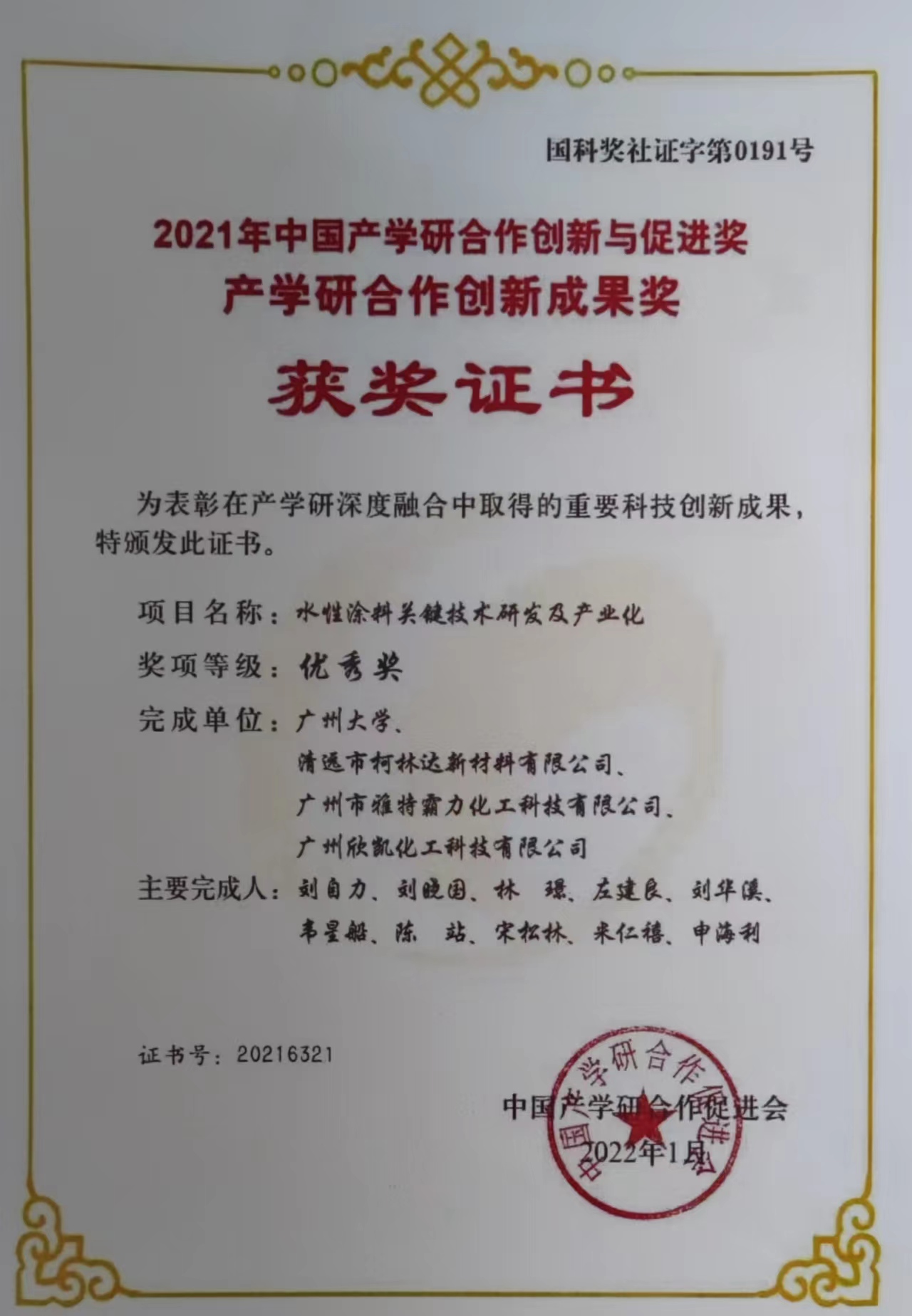 欣凱公司與高校廣州大學(xué)、和清遠(yuǎn)市柯林達(dá)新材料有限公司、廣州市雅特霸力化工科技有限公司簽署校企戰(zhàn)略合作協(xié)議。高校與各企業(yè)結(jié)合各自優(yōu)勢(shì),圍繞技術(shù)研發(fā),資源共享,成果轉(zhuǎn)化等方面開展深度合作,聯(lián)合申報(bào)的《水性涂料關(guān)鍵技術(shù)研發(fā)級(jí)產(chǎn)業(yè)化》獲的“2021年中國產(chǎn)學(xué)研合作創(chuàng)新與促進(jìn)獎(jiǎng)、產(chǎn)學(xué)研合作創(chuàng)新成果獎(jiǎng)”。
